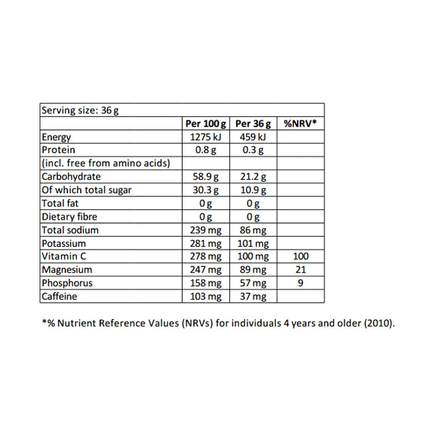 Maltodextrin syrup, Reversed osmosis water, Fructose, Magnesium lactate, Pectin citrate, L-taurine, Potassium citrate, Di-sodium phosphate,Mono-potassium phosphate, Sodium chloride, Preservative (Potassium sorbate), Flavouring, Citric acid anhydrous.