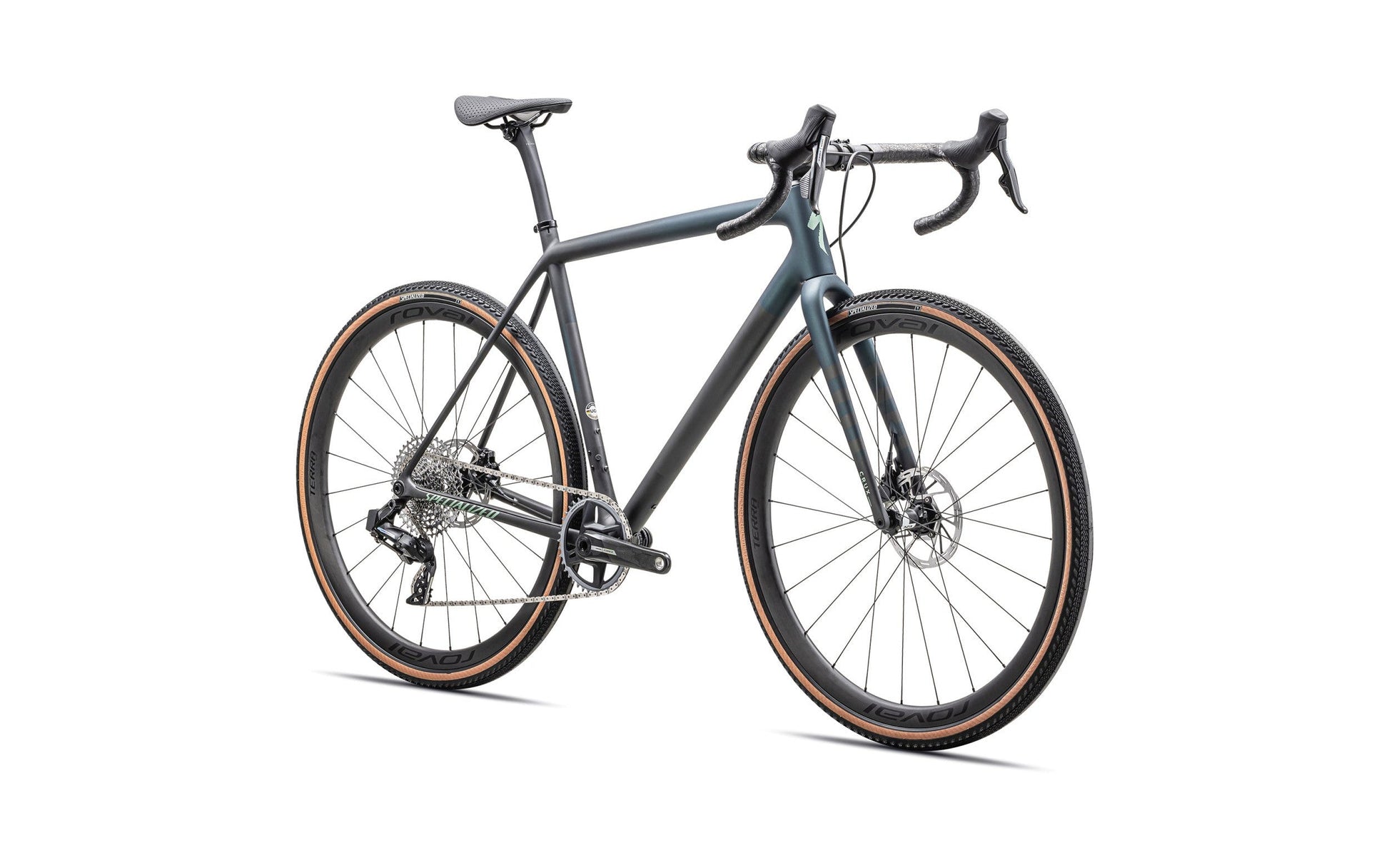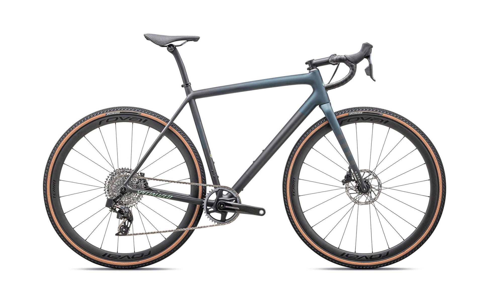 This Crux Pro comes spec'd with a accurate and quick-shifting SRAM Force eTap AXS hydraulic disc groupset, lightweight and durable Roval Terra CL Disc wheels, and 2Bliss Ready, 700x38mm Pathfinder Pro tires that hookup over nasty terrain."